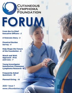 FORUM 2026 • Issue 1 www.clfoundation.org From the Co-Chief Executive Officers - 2 A Veterans Story - 3 Finanical Burden Survey - 4 Help Shape the Future of the Foundation - 6 Watch and Wait Approach - Pros and Cons - 7 Young Investigator Summarizes Cutaneous Lymphoma Research - 8 Frequently Asked Questions - 10 Planned Giving - 14 Cutaneous Lymphoma Foundation